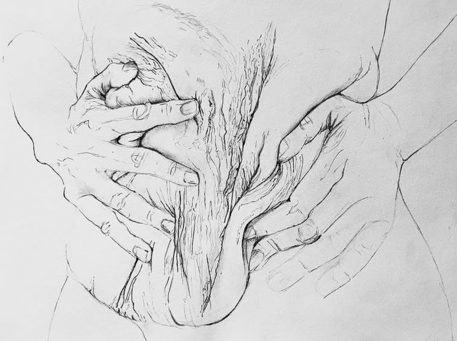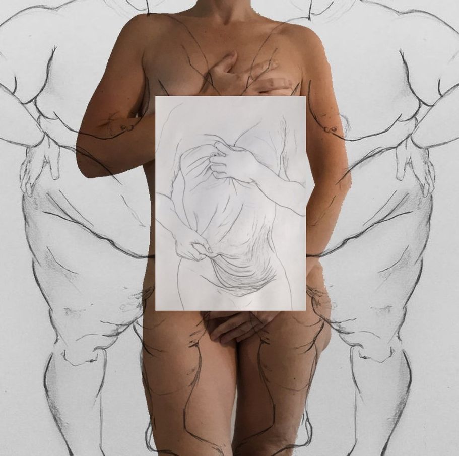 Drawing, Photography and digital collage. Multiple series of drawings made from 2018 to date. The drawings below highlight the loose skin on my body after weight loss surgery and pregnancy, and the stigma attached to the body.